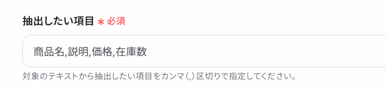 例えば、指示内容を入力する部分に「タイトルにある商品名を抽出してください」など情報の位置を指定したり、「画像URLは除外してください」のような不要な情報を除外する条件を入れることも可能です。