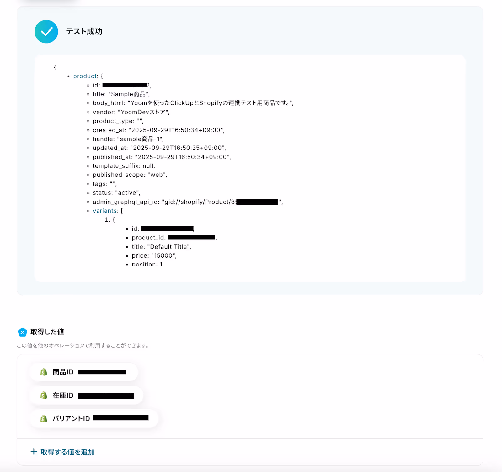 必須の設定項目は以上ですが、「商品説明」や「価格」「SKU」なども設定できるので、必要に応じて適宜「取得した値」を活用しながら設定してみてくださいね!
