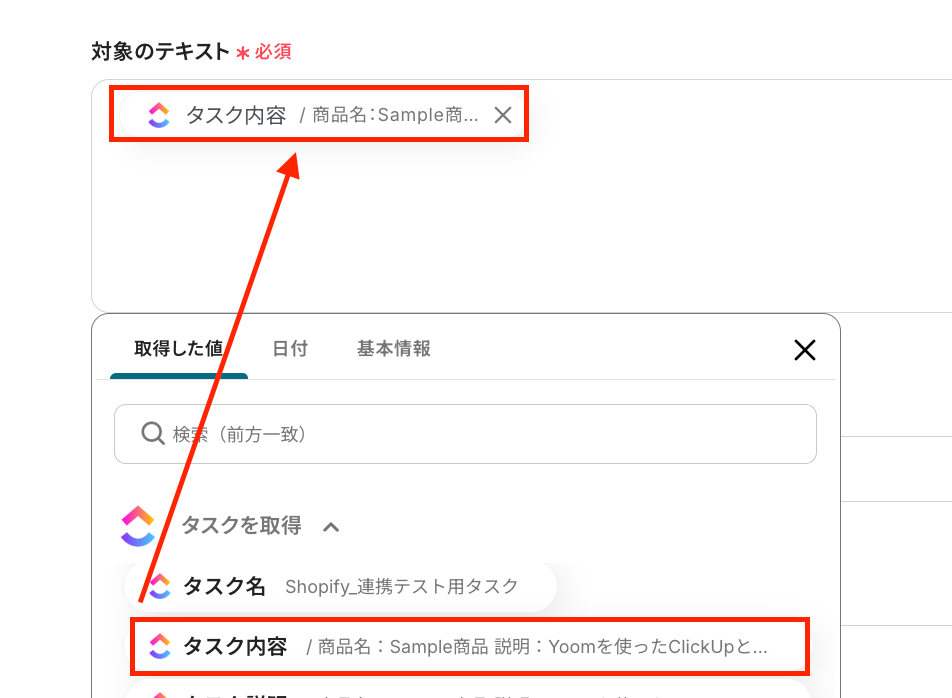 (候補は、連携しているClickUpアカウントに紐づいて表示されます)