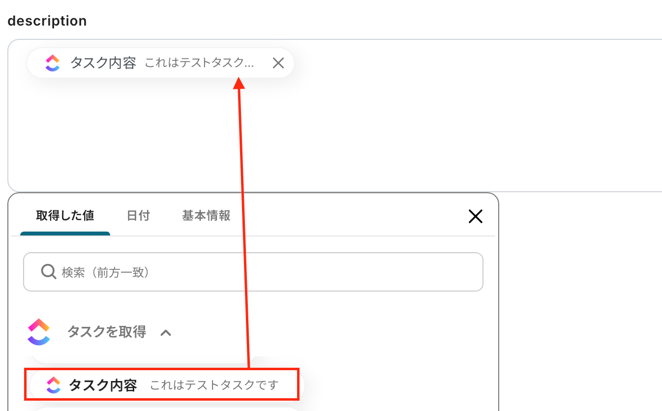 「description」:先ほどと同様にアウトプットを引用して、タスクの詳細を設定します。任意の文章と組み合わせて自由に設定してください。