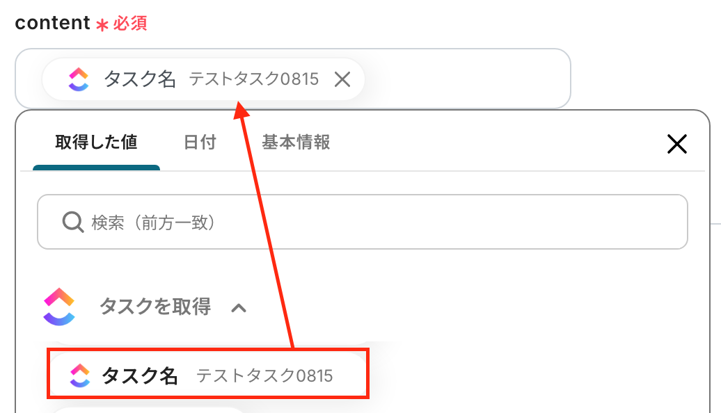 「content」:入力欄をクリックして表示されるアウトプットを引用して設定します。