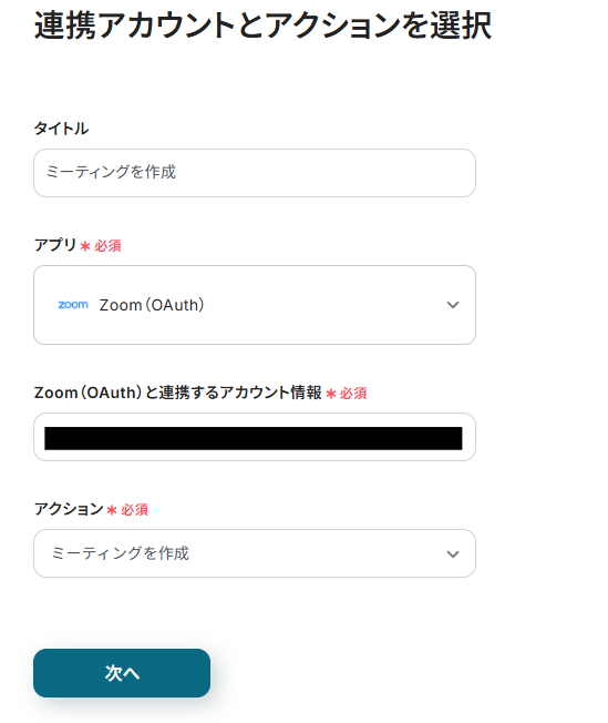 連携アカウントとアクションを選択する画面が表示されるので、今回連携するZoomのアカウントを確認し「次へ」をクリックします。