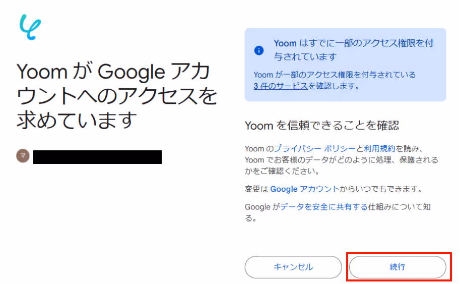 YoomがGoogleアカウントにアクセスすることに対する権限許可画面が表示されるので、「続行」を押します。