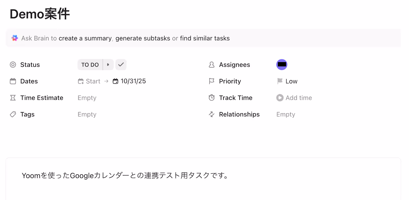 次に、ClickUpに新しくタスクが作成された事を、正常に検知できるかを確認するためのテストを行います。
