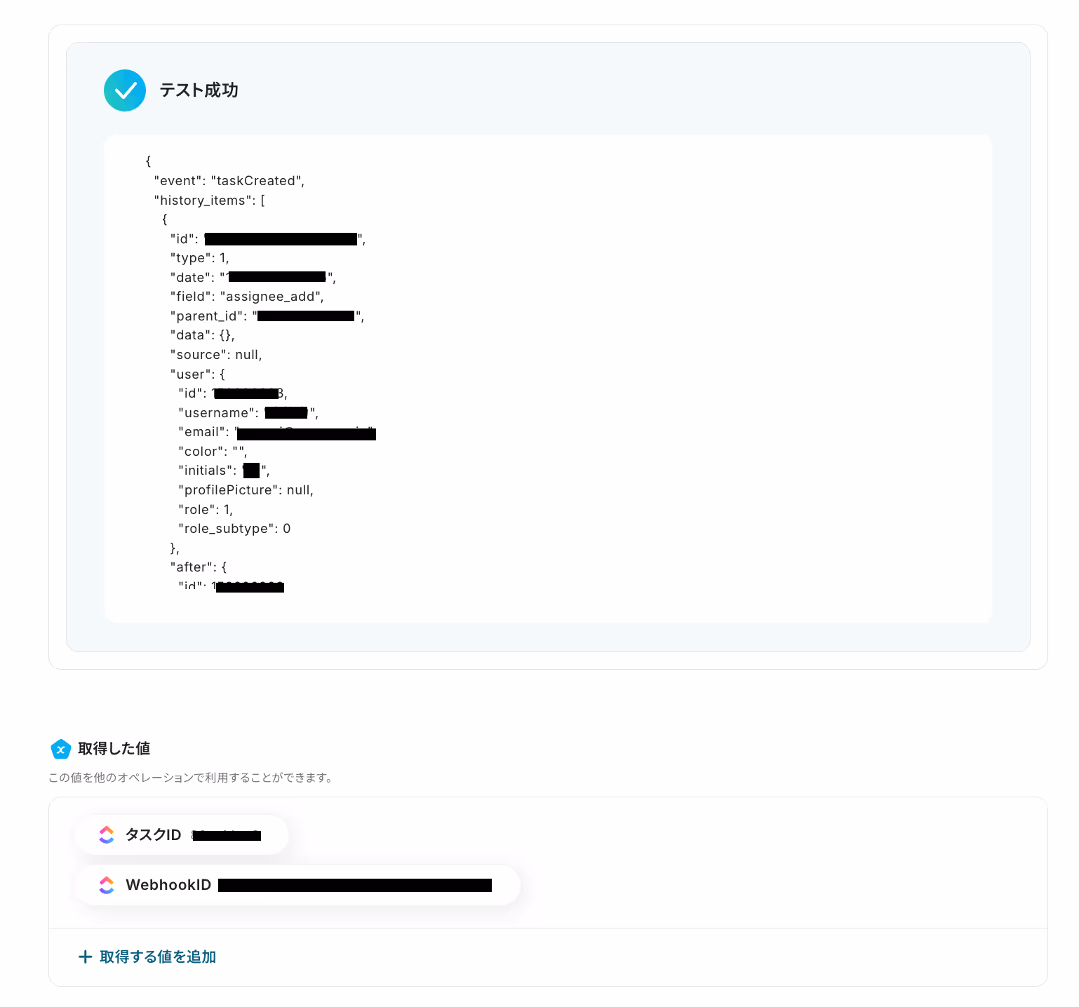 テストが成功すると、先ほど作成したタスクの情報が「取得した値」に抽出されるので、内容を確認してくださいね!