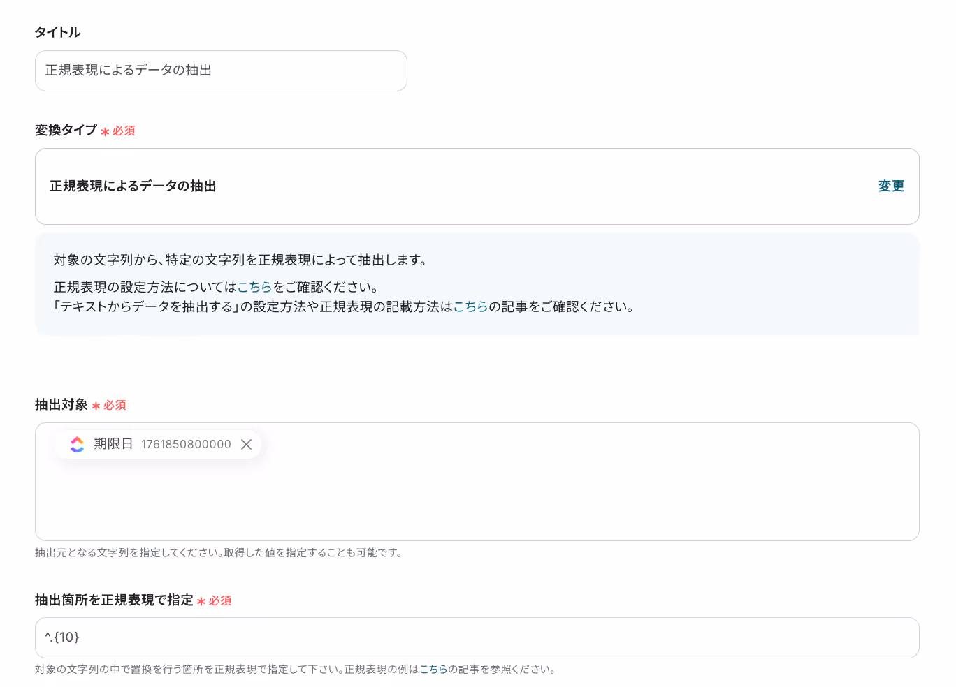 ここでは、ClickUpに作成されたタスクの「期限日」を、指定する正規表現に置き換えて抽出する設定をしていきます。