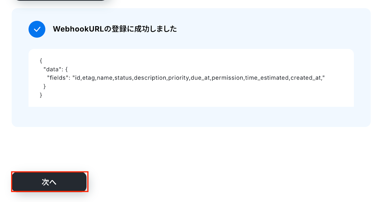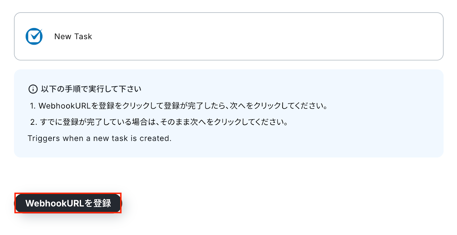 「WebhookURLを登録」をクリックして、YoomがClio ManageからWebhookを正しく受け取れるか確認しましょう。
