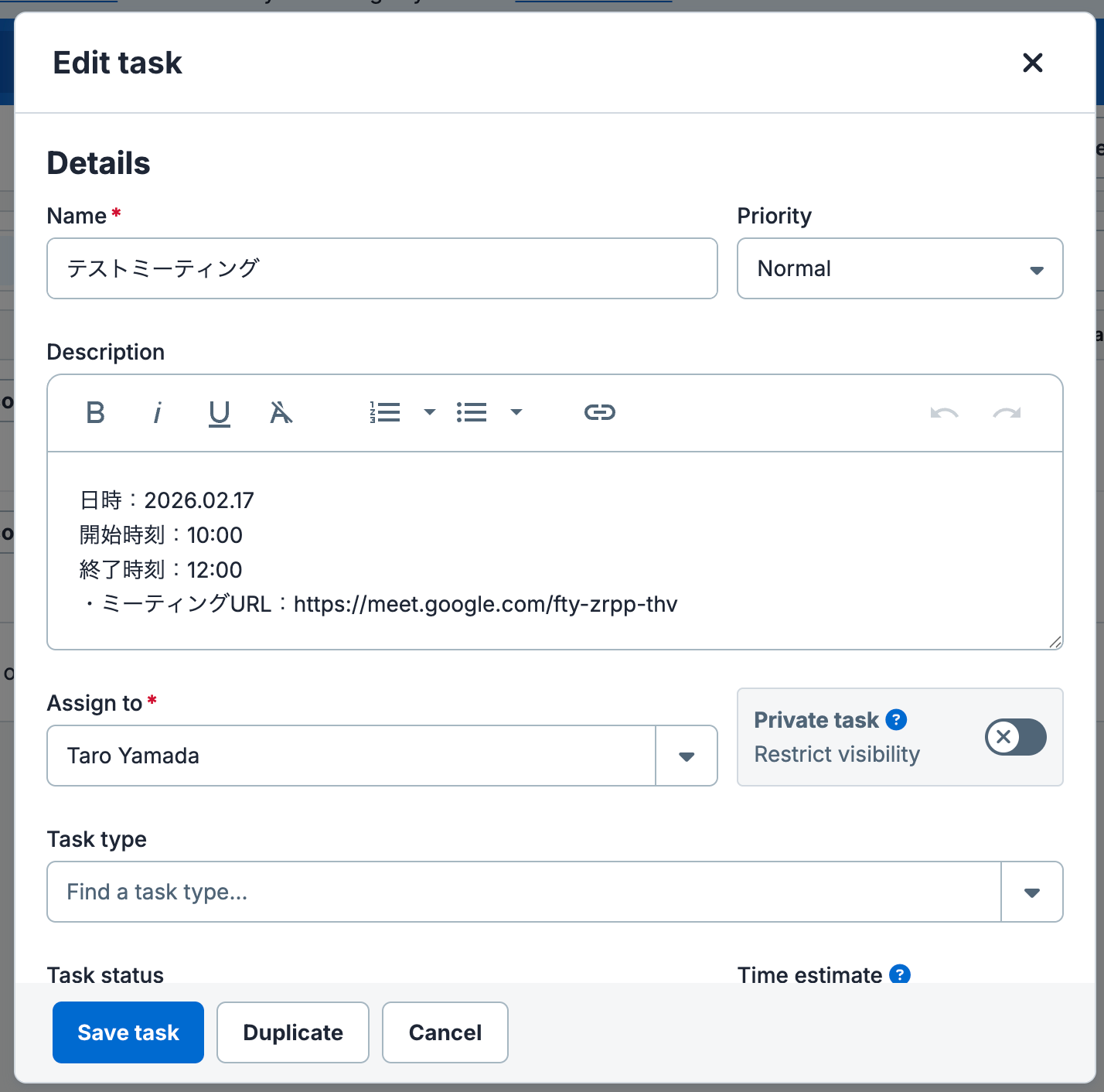 実際にClio Manageでタスクを作成し、Google MeetのURLなどが正しく生成・反映されるかを確認してみましょう。