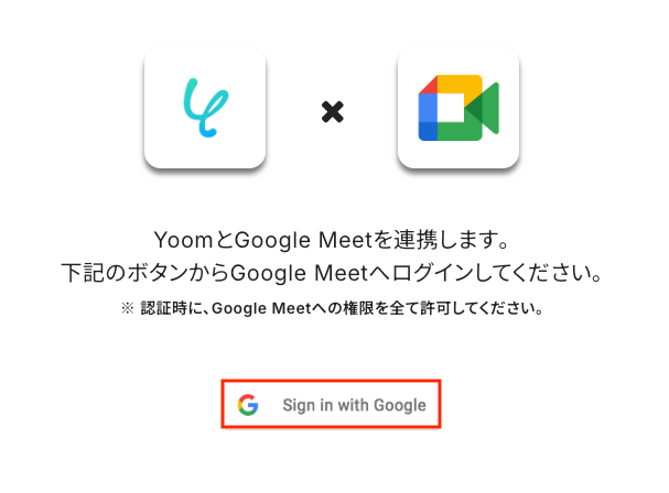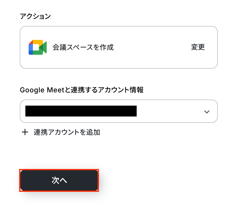 アクションはあらかじめ設定されているため、そのまま内容を確認してください。 Google Meetと連携するアカウント情報に問題がなければ、「次へ」をクリックします。