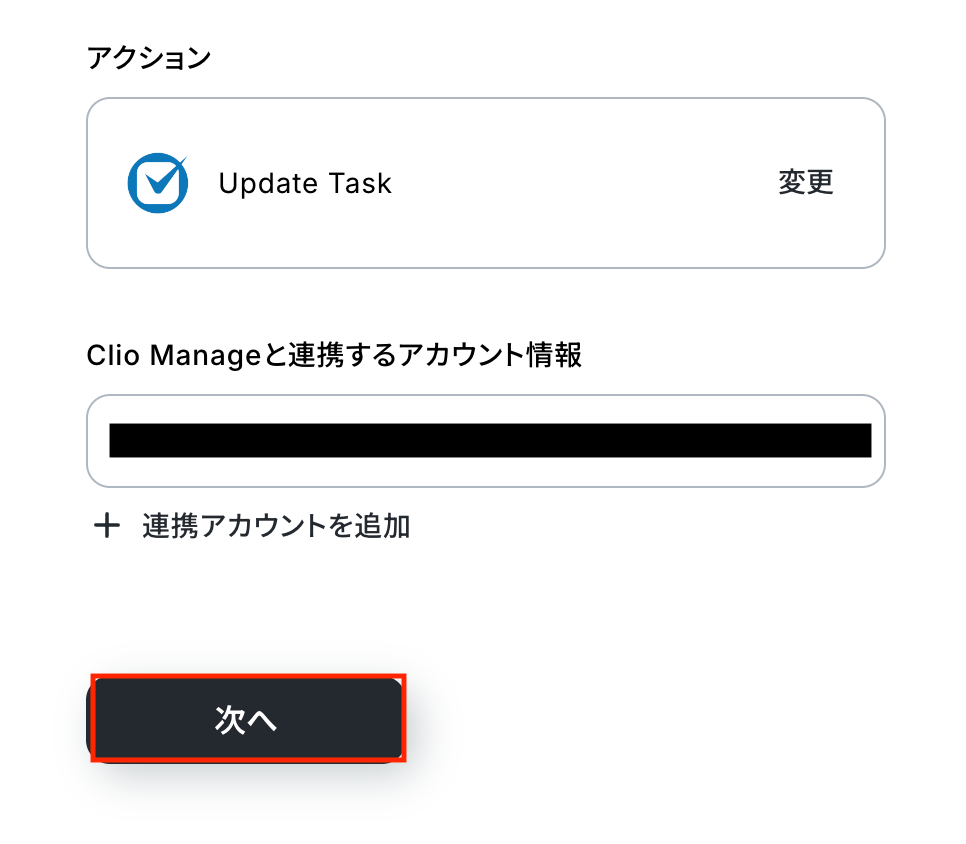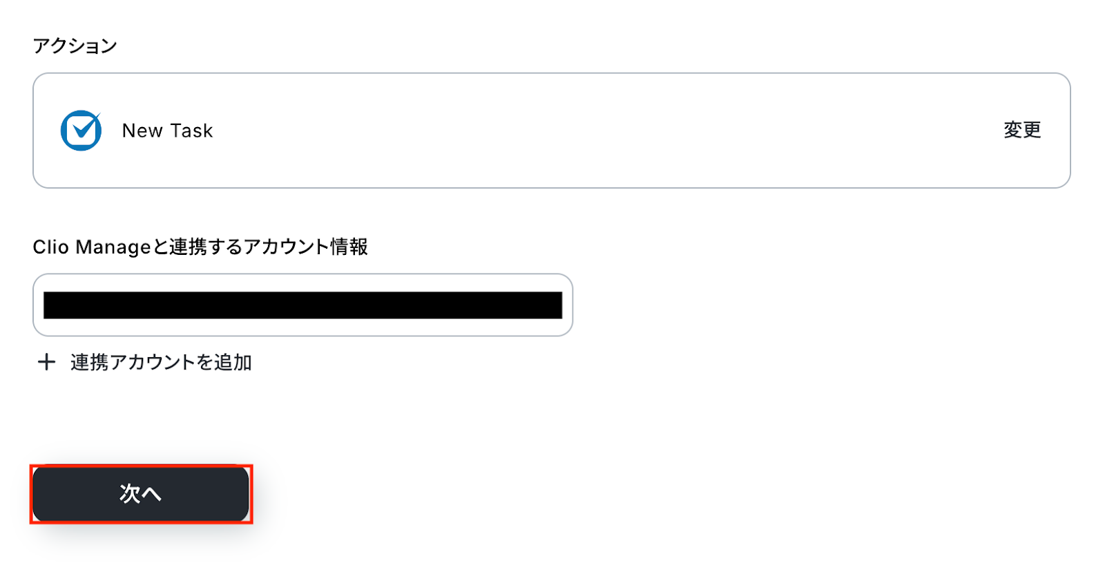 アクションはあらかじめ設定されているため、そのまま内容を確認してください。 Clio Manageと連携するアカウント情報に問題がなければ、「次へ」をクリックします。