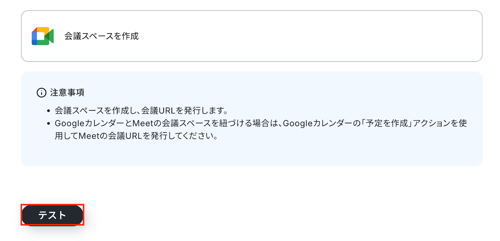 テストに成功すると、Google Meetに作成された会議に関する情報が表示されます。 以下の取得した値はこの後のステップで利用できます。