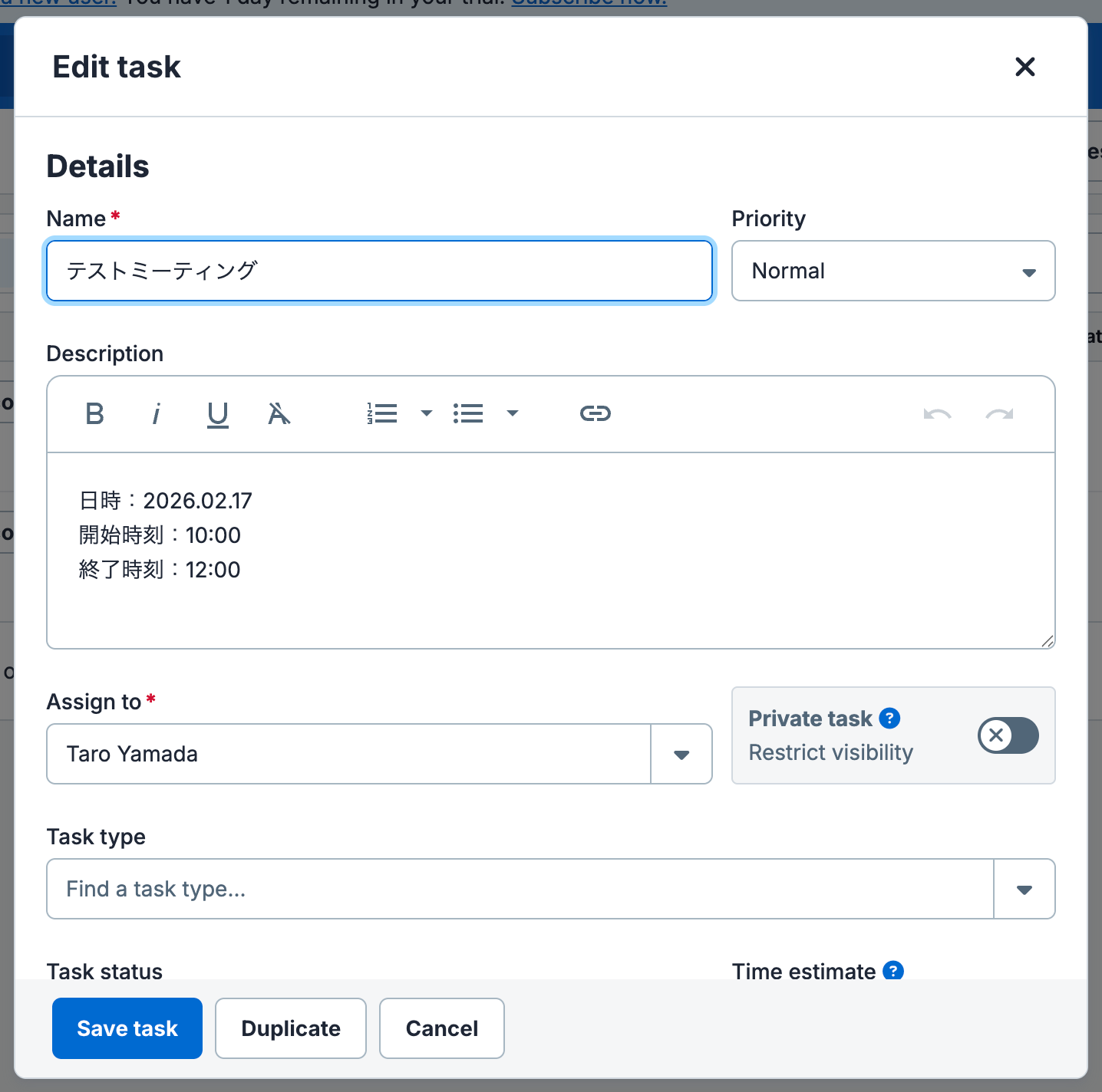 テスト用に、Clio Manageでタスクを作成しておきましょう。 今回は以下の内容で作成しました。
