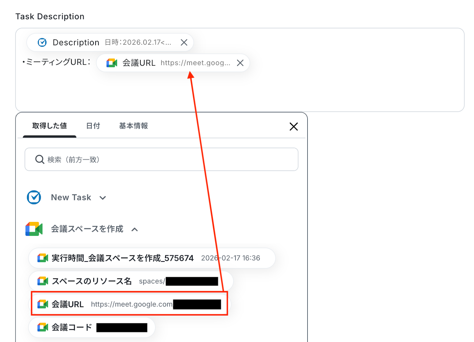 Task Description こちらもTask IDと同様に、入力欄をクリックすると取得した値が表示されるので選択して入力が可能です。 テキスト(固定値)と取得した値を組み合わせて作成することで、内容を自由にカスタマイズできます。