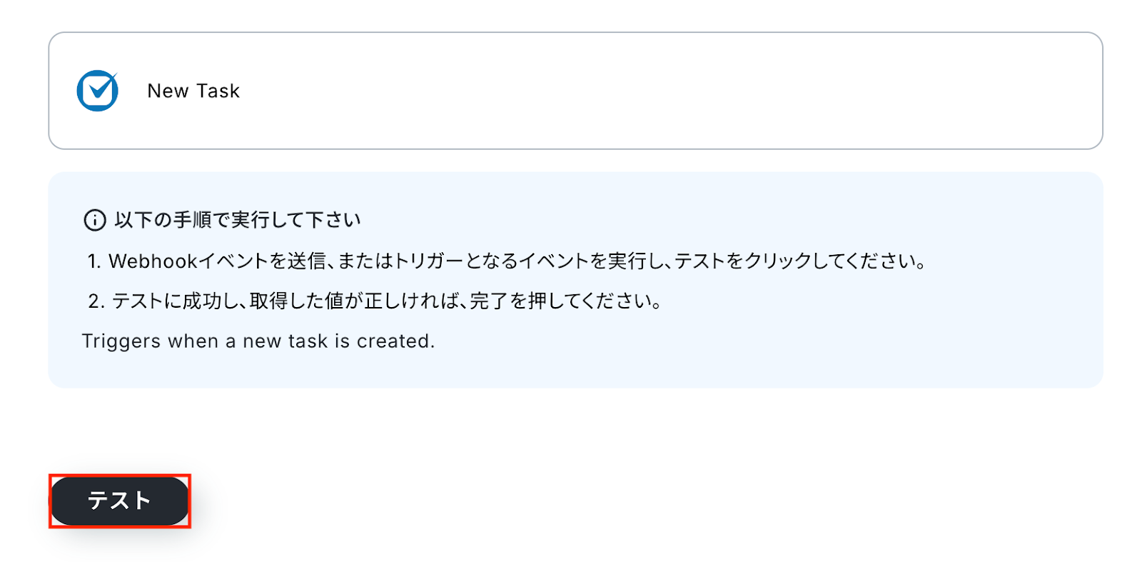 タスク作成が正しく受信されるかを確認するため、「テスト」をクリックします。