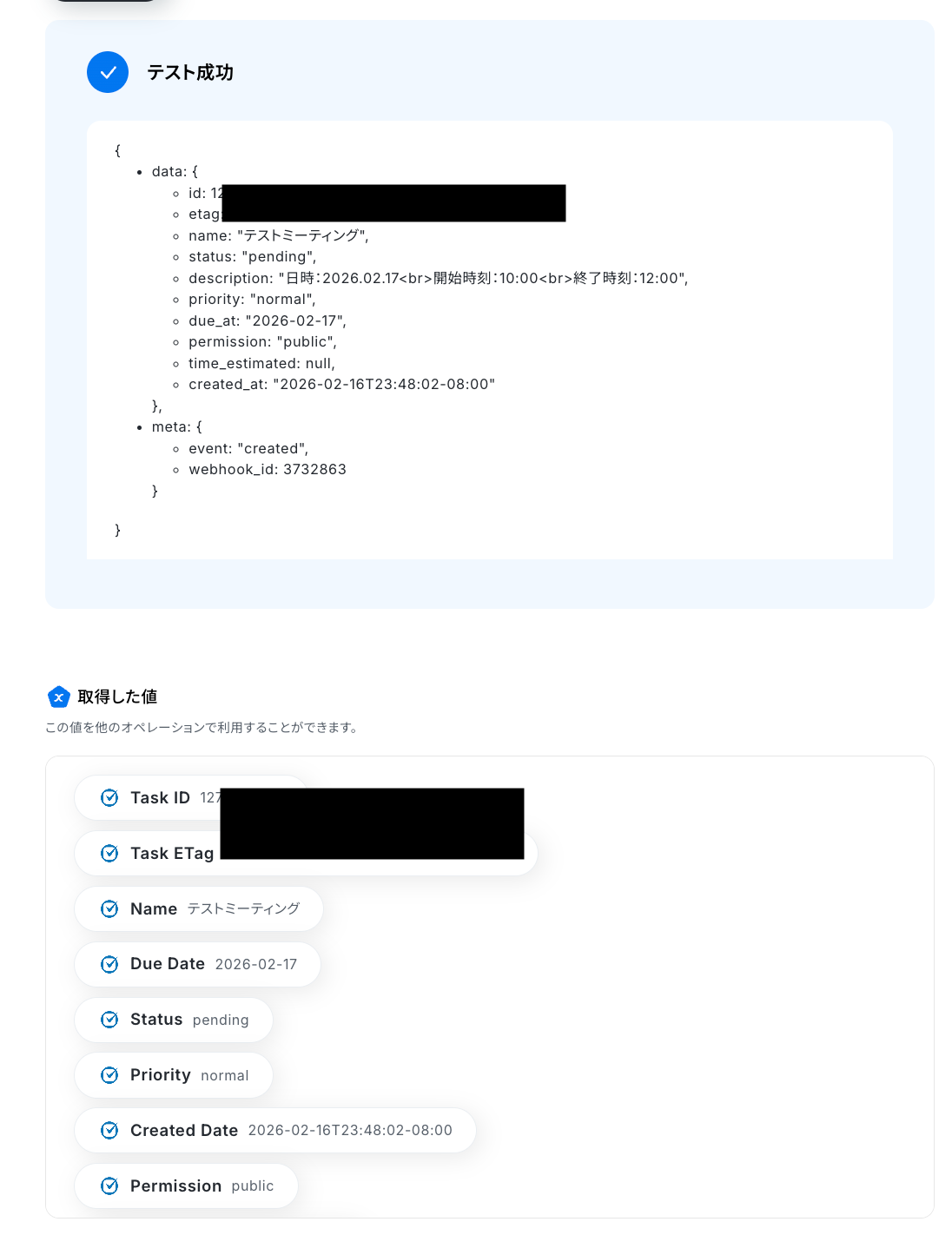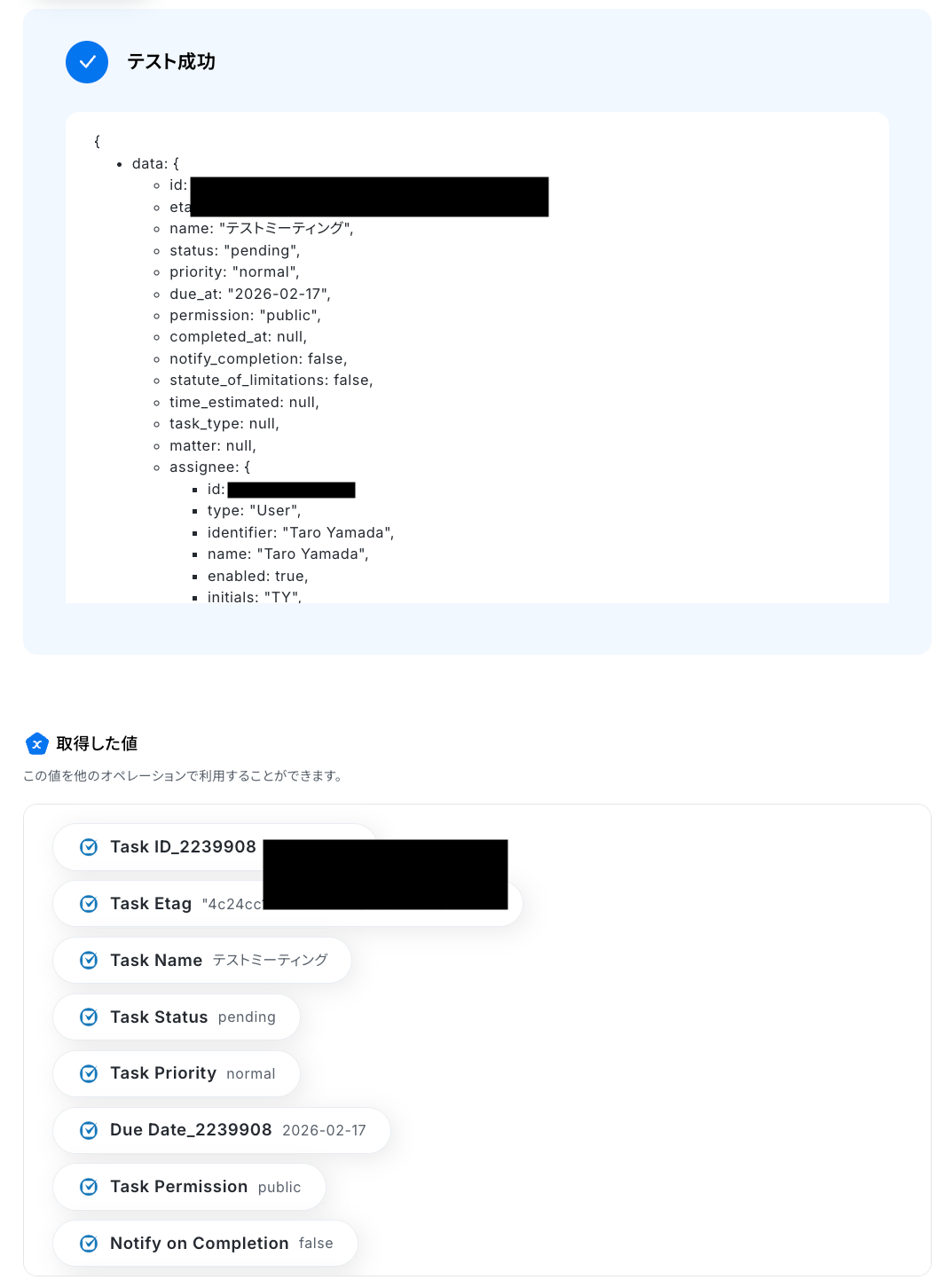 テストに成功すると、Clio Manageに作成されたタスクに関する情報が表示されます。 以下の取得した値はこの後のステップで利用できます。