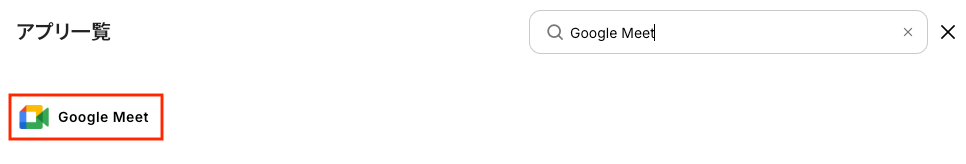 新規接続をクリックしたあと、アプリのメニュー一覧が表示されるのでGoogle Meetと検索し対象アプリをクリックしてください。