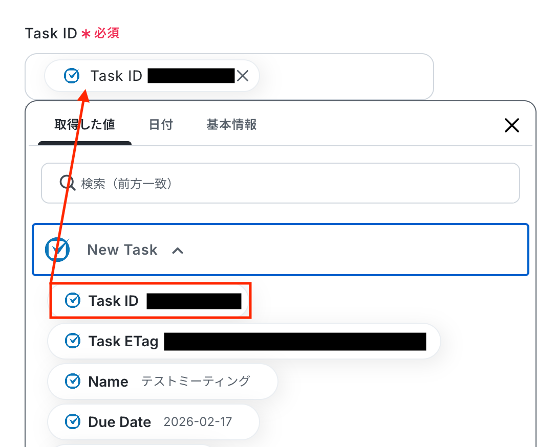 Task ID 入力欄をクリックすると、前のステップでClio Manageから取得した値が表示されるので、選択して入力しましょう。 取得した値を活用することで値が固定化されず、フローボットを起動するたびに最新の情報を自動で反映できます。 なお、テキストを直接入力した部分は固定値とされるため、取得した値を活用せず設定を行うと毎回同じタスクが更新されてしまうので注意が必要です。