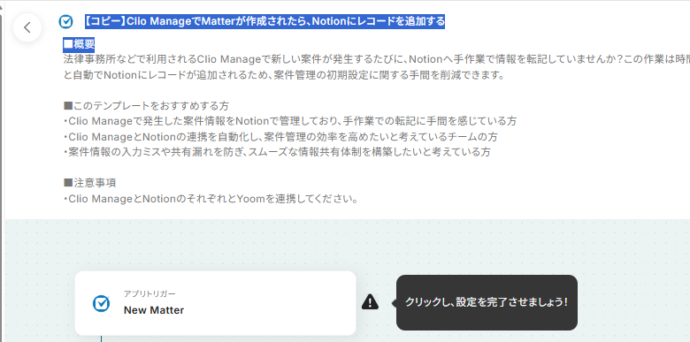 - Clio Manageのトリガー設定およびNotionのアクション設定
