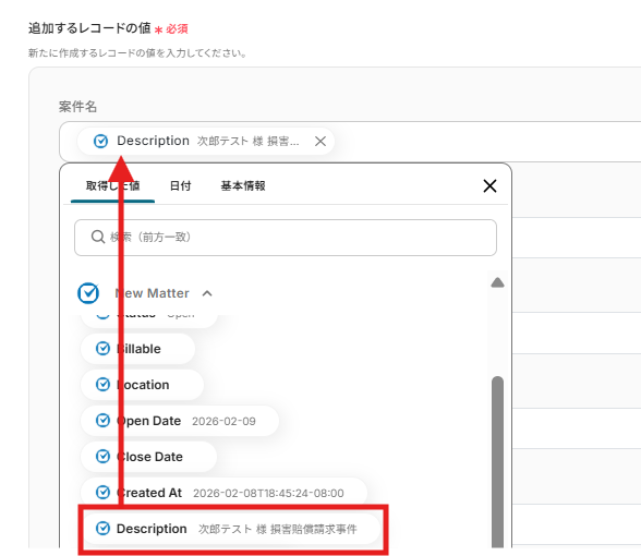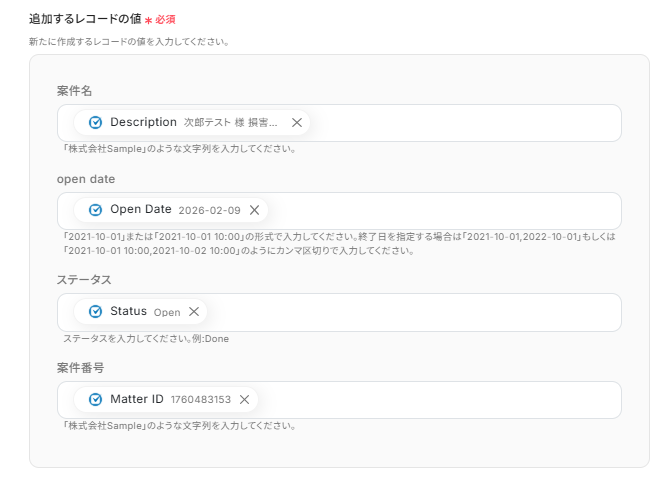 - Clio Manageから取得した案件名やクライアント情報など、どの情報をNotionのどのプロパティに追加するかも自由に設定できます。