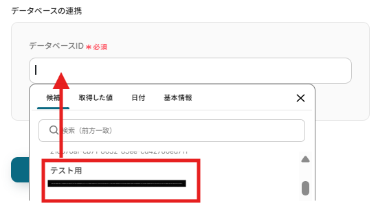 アクションは変更せず、アカウント情報がマイアプリ連携をしたアカウントと一致することを確認し、事前に準備しておいたデータベースIDをボックスの候補から選択します。