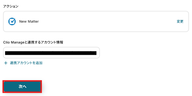 - 次に、トリガーでClio Manageを選択し、「New Matter」というアクションを設定します。