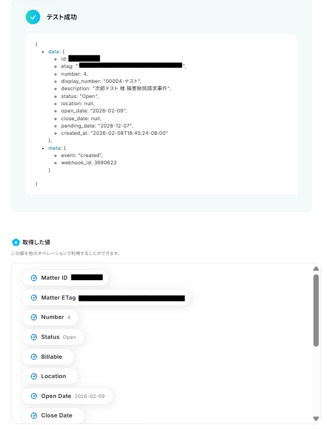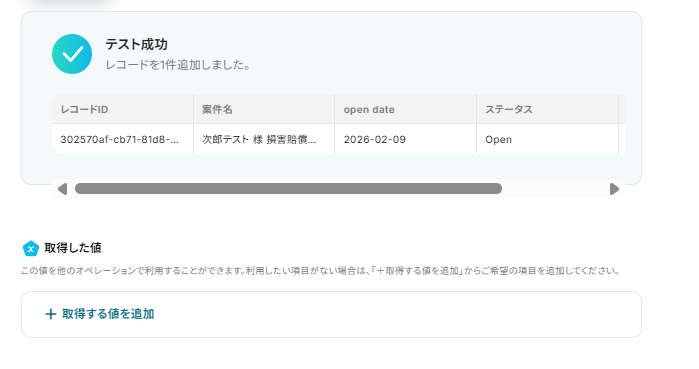 ※取得した値とは 設定時の「テスト」で取得した値のことです。後続ステップの入力値として利用でき、実行のたびに最新の内容に更新(変動)されます。