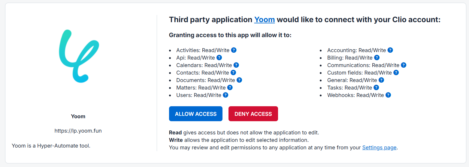 ログイン後、Yoomのアクセス権限が表示されますので、ご確認の上、「 ALLOW ACCESS 」をクリックしてマイアプリ登録を完了してください。