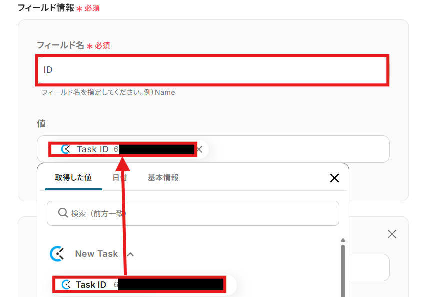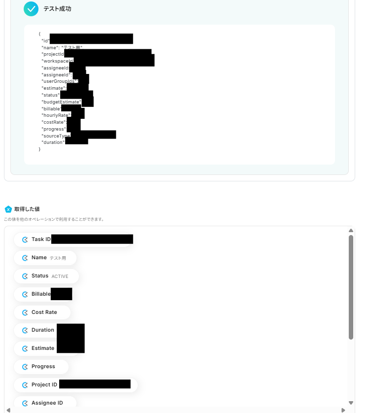 「値」を「取得した値」から設定します。「取得した値」は変数となるので、Clockifyで新しくタスクが作成される度にそのデータを活用可能になります!