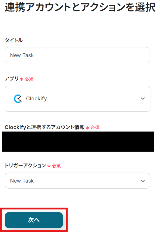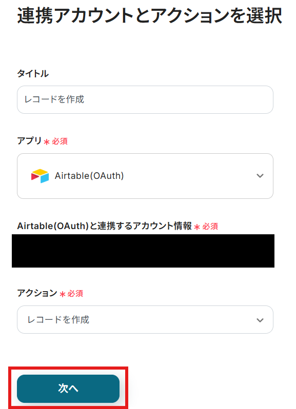 タイトルと連携するアカウント情報を確認し、アクションはテンプレート通りのまま「次へ」をクリックして進んでください。