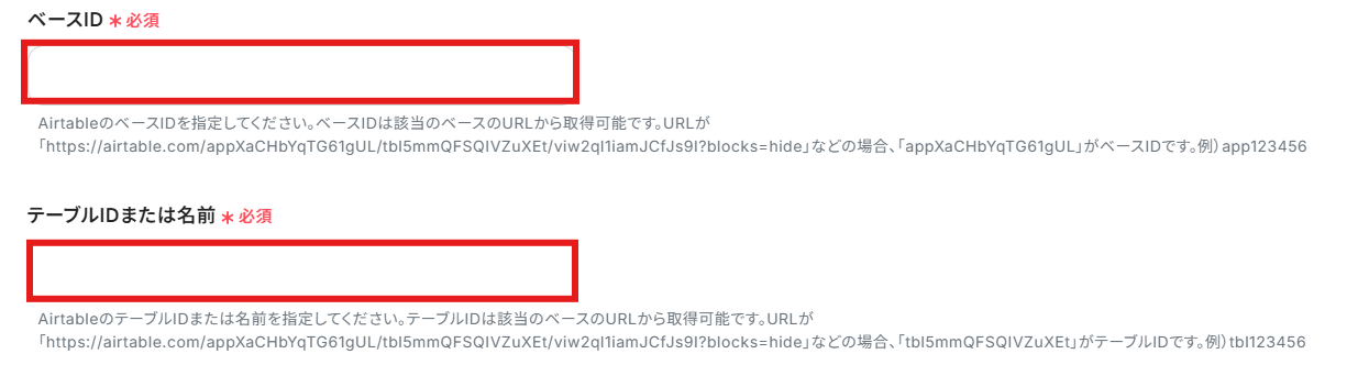 「ベースID」と「テーブルIDまたは名前」を注釈を参考に手動で入力しましょう。