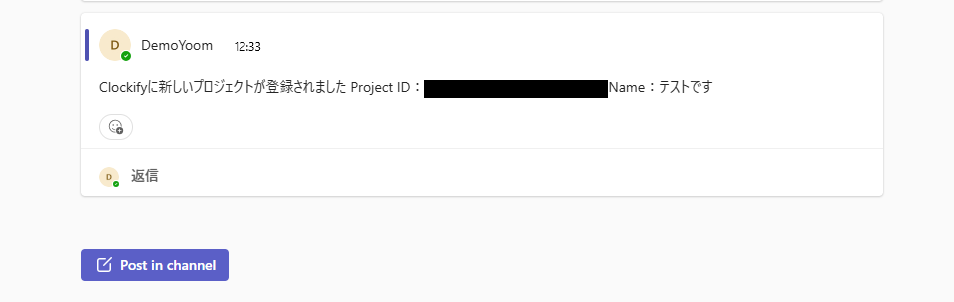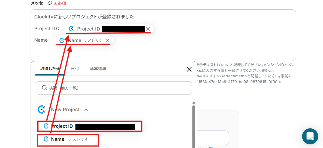 メッセージは、自由に設定することができます。 例えば、下記画面のように設定するとClockifyにプロジェクトが追加されたら「Project ID」と「Name」を取得し、自動でMicrosoft Teamsのメッセージに反映できます。 用途に合わせて、使用したいアウトプットやメッセージの内容を変更して使用してみてください! 取得した値を活用することで、固定値ではなく、トリガーが実行されるたびに最新情報の反映ができます。