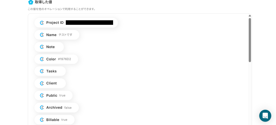 テストが成功すると、Clockifyに作成したプロジェクトの情報が取得した値(アウトプット)に表示 されます。 ここで取得した値は、後続の設定で活用可能なため、誤りが無いか確認ができたら設定を保存しましょう。 ※取得した値( アウトプット)についての説明は、こちら をご確認ください。
