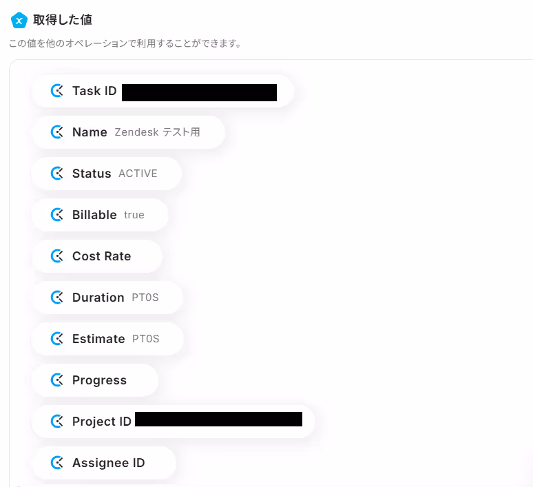 ここで取得した値を活用することにより、今後新たにClockifyでタスクが作成される度に、新しい情報を反映したチケットがZendeskに作成されていきます。