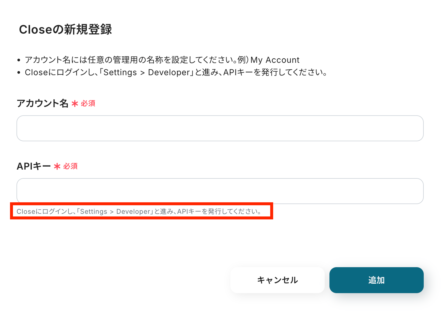 Closeを検索すると、新規登録画面が表示されるので「アカウント名」と「APIキー」を入力して「追加」ボタンをクリックしたら連携完了です!