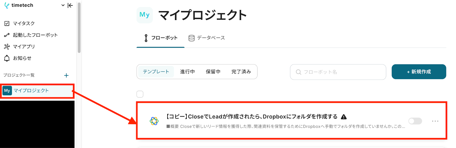 左側にあるメニューの「マイプロジェクト」から、コピーしたテンプレートを開きます。