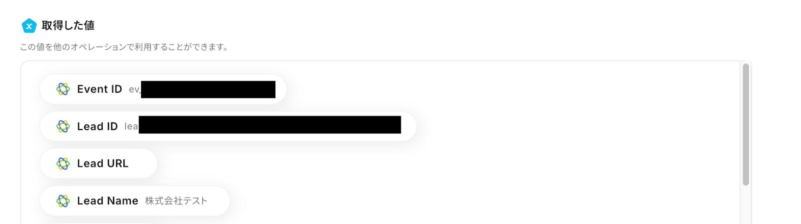 テストに成功すると「取得した値」の欄にCloseに登録したLeadに関するデータがアウトプットされます。
