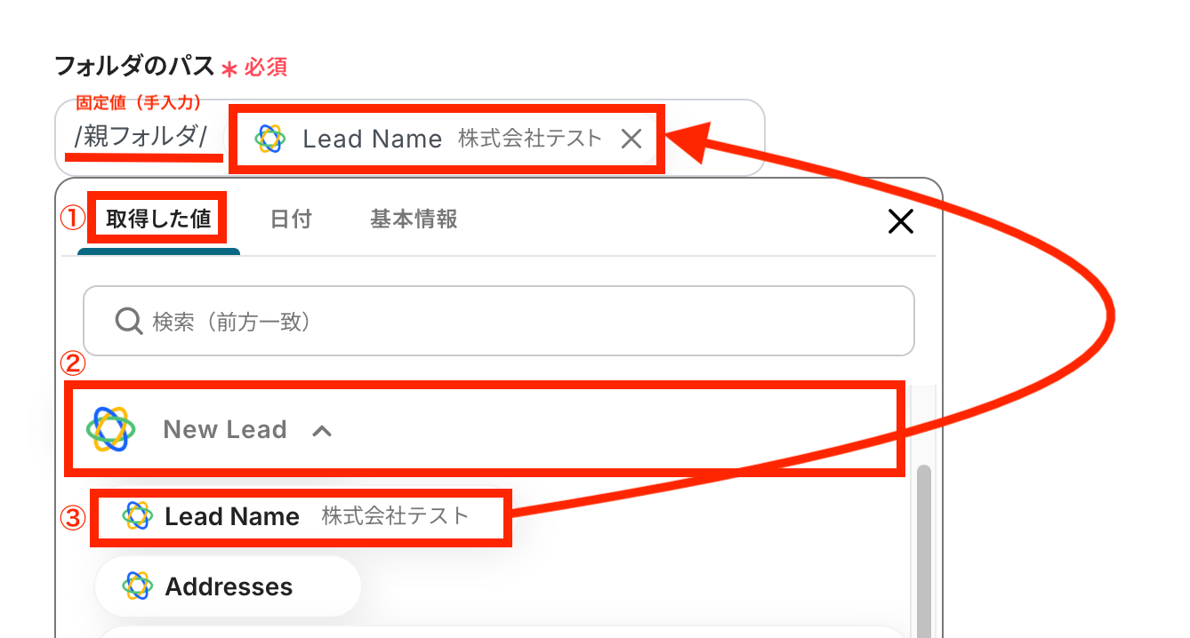 今回はCloseで作成したLeadと同じ名称のフォルダを作成したいので、ステップ3で取得した値を埋め込みます!