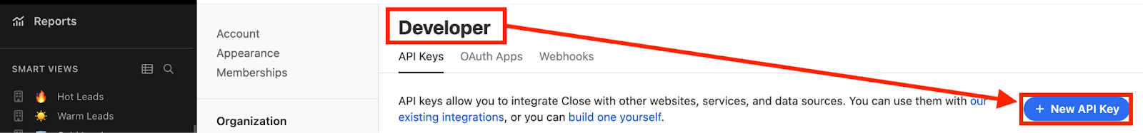 Close画面に移動したら「New API Key」をクリックするとAPIキーを発行できます!