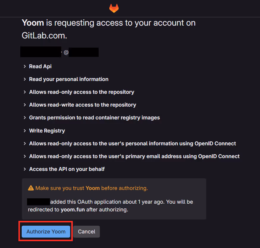 任意のGitLabアカウントでログインすると、Yoomがアクセス権限を求める以下の画面が表示されます。下部にある「Authorize Yoom」をクリックしてください。