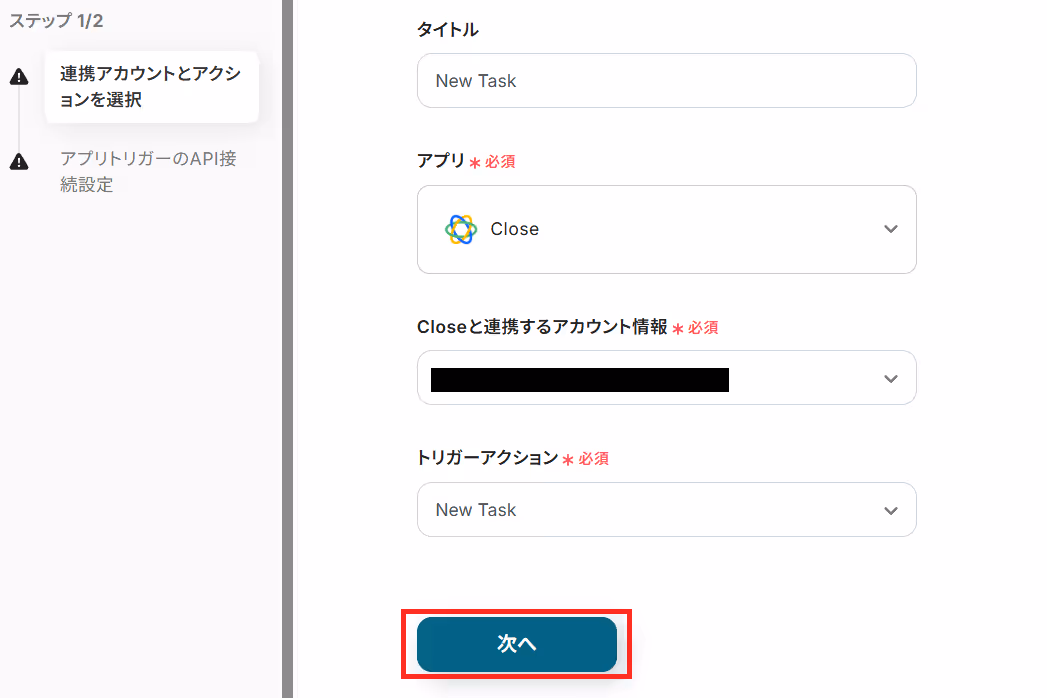 タイトルを任意で設定し、Closeと連携するアカウントやアクション内容を確認したら「次へ」を押してください。