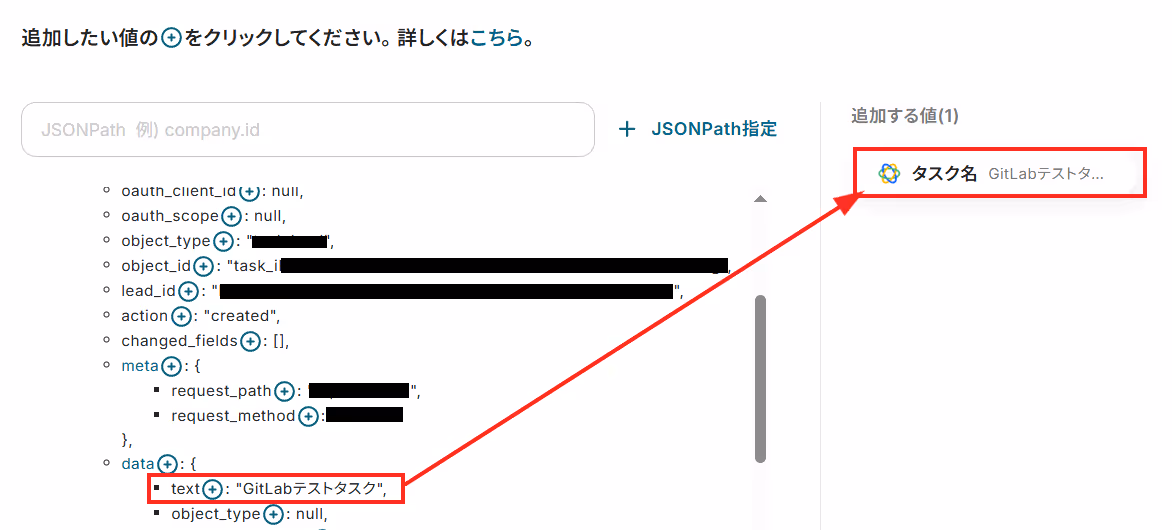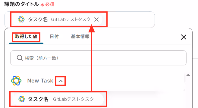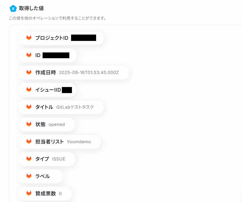 必要な設定を終えたら「テスト」ボタンを押してみましょう。取得した値に、GitLabで新しく作成されたイシューの内容が表示されていれば成功です!