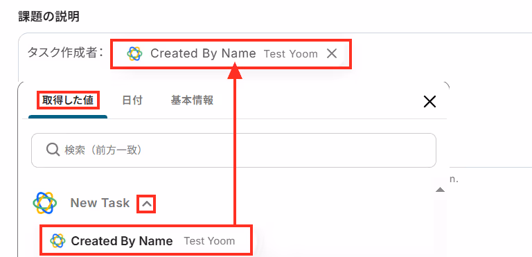 例えば手入力による固定値で「タスク作成者:」と入力し、その後に取得した値を組み合わせて、以下のような設定もできます。
