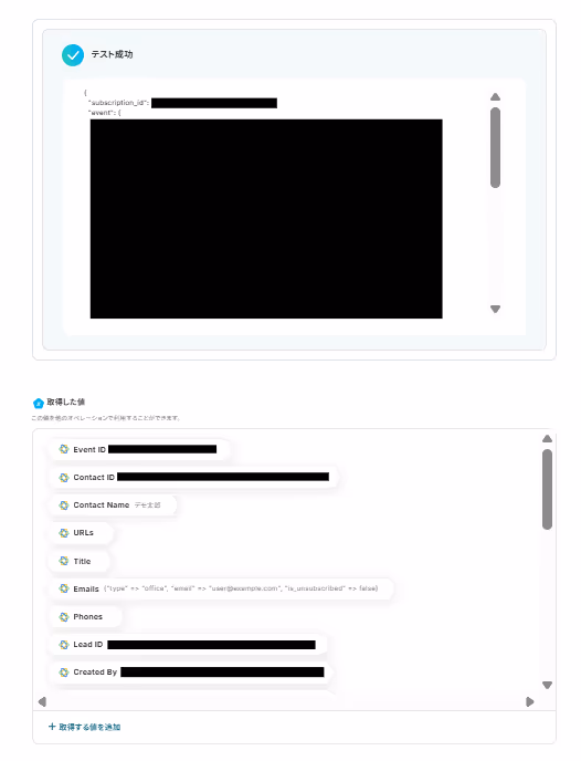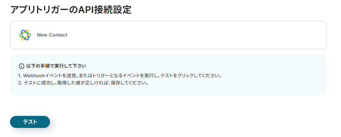 次の画面では実際にCloseでContactを作成後、Yoomに戻り「テスト」をクリックします。