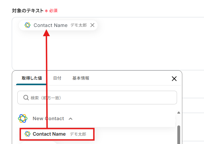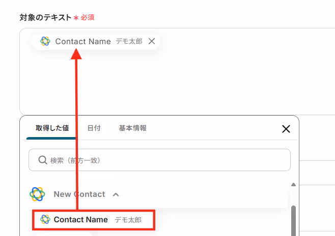 対象のテキストには以下のようにCloseから取得した値を用いて「Contact Name」を入力しましょう。