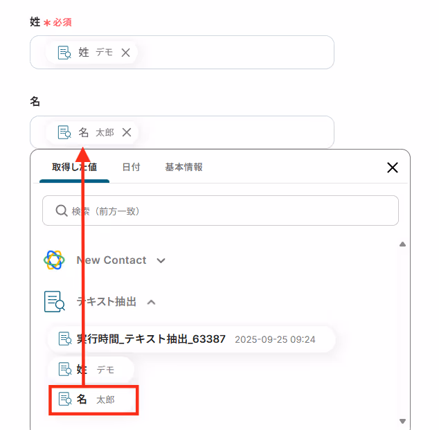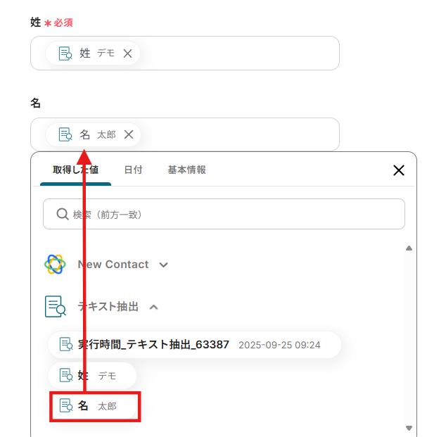 「姓」「名」をテキスト抽出の内容から選択し、入力しましょう。