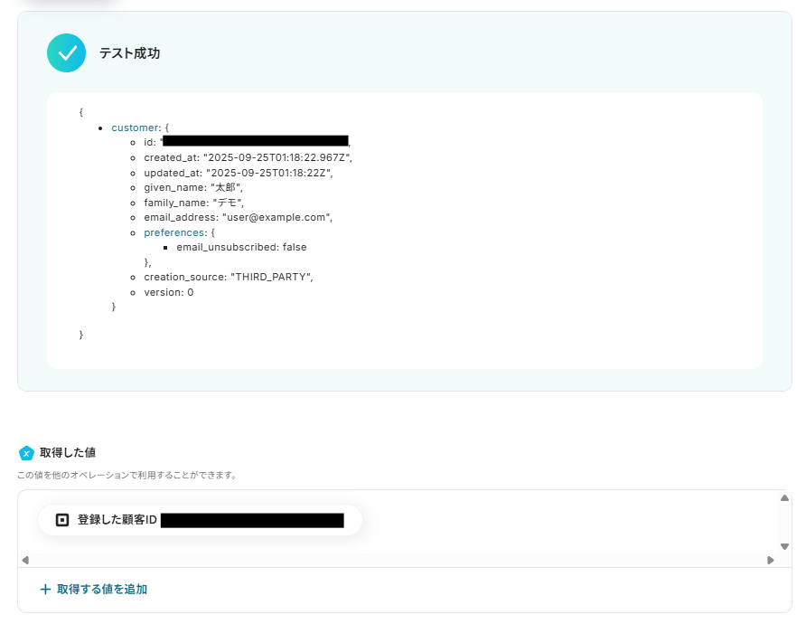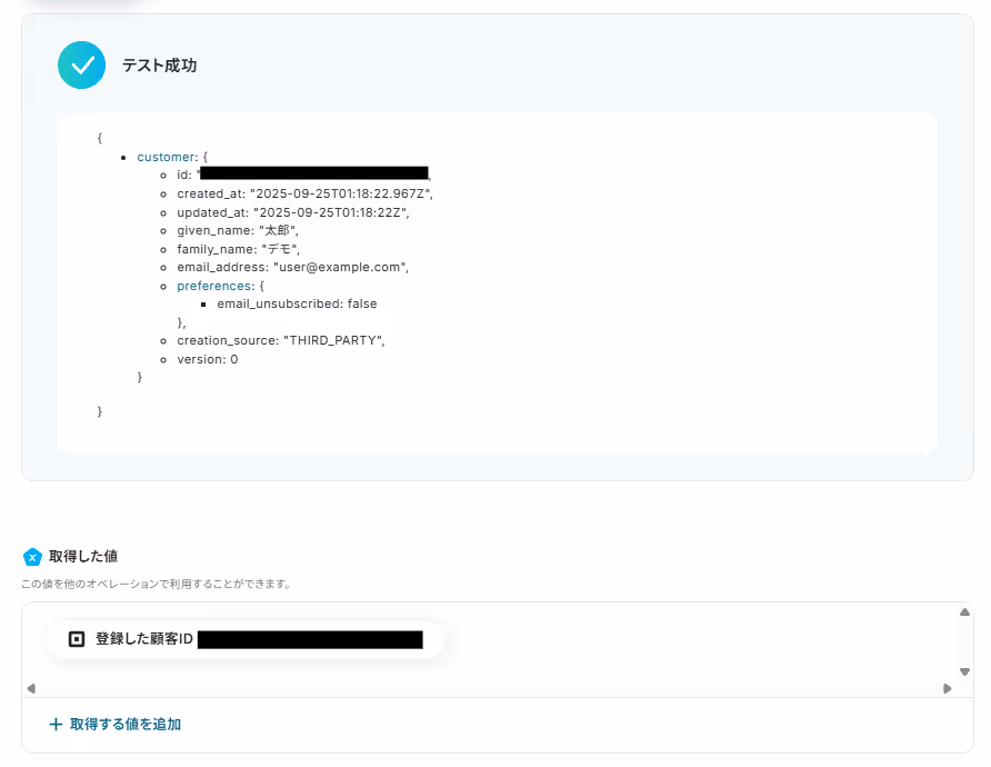 入力ができたら「テスト」をクリックし、実際にSquareで顧客情報が作成されているか確認しましょう。