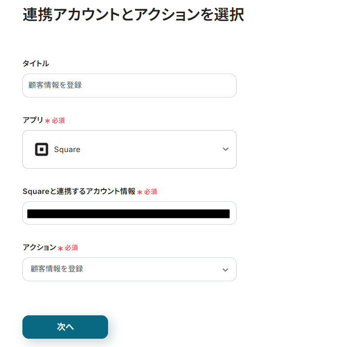 連携アカウントとアクションを選択する画面が表示されるので、今回連携するSquareのアカウントを確認し「次へ」をクリックします。