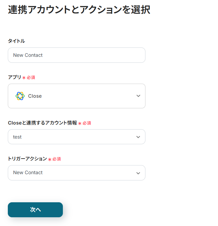 連携アカウントとアクションを選択する画面が表示されるので、今回連携するCloseのアカウントを確認し「次へ」をクリックします。