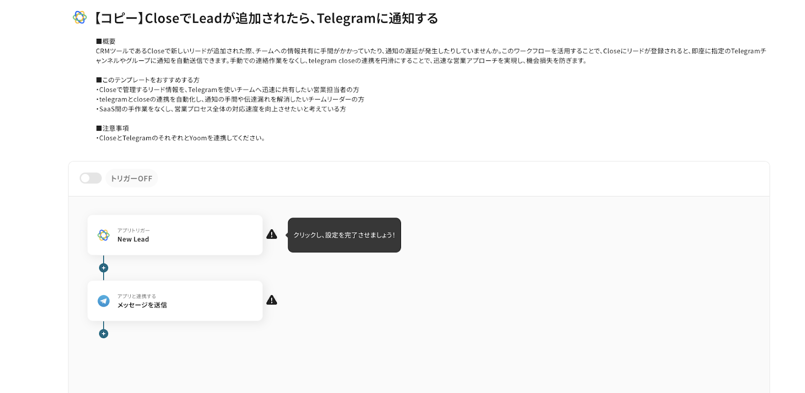 それでは、さっそく実際にCloseとTelegramを連携したフローを作成してみましょう!