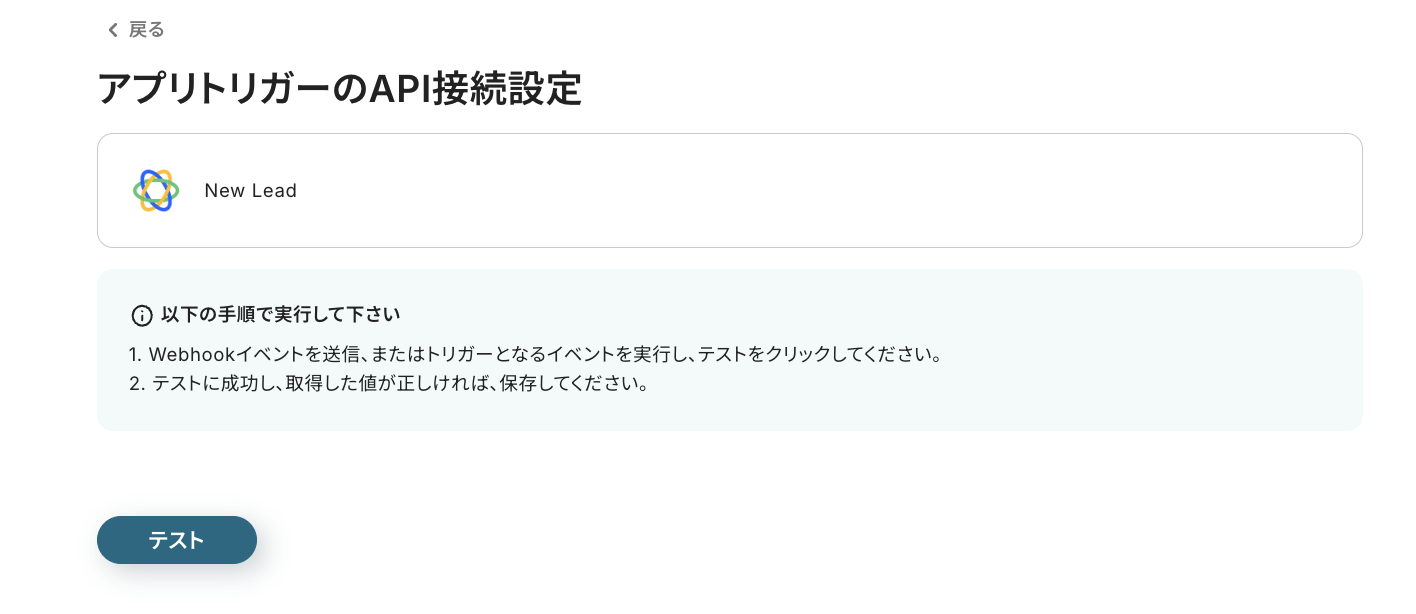 次の画面に移る前に、Close側でWebhookイベントを送信、またはトリガーとなるイベントを実行する必要があるため、フローを作成する前に、Close側で新しいリード情報を追加しておいてください。
